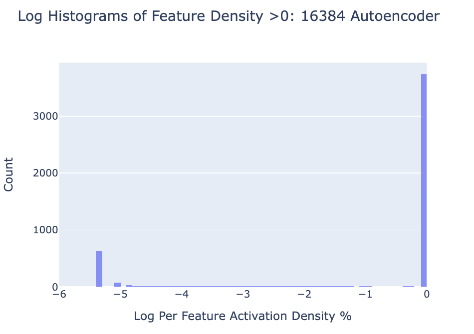 What is happening with all these dead features are they simply ultra-low density? If we look at the log histogram of feature density filtering everything above 0, it looks like few features are of density or below. The vast majority never are less active than .