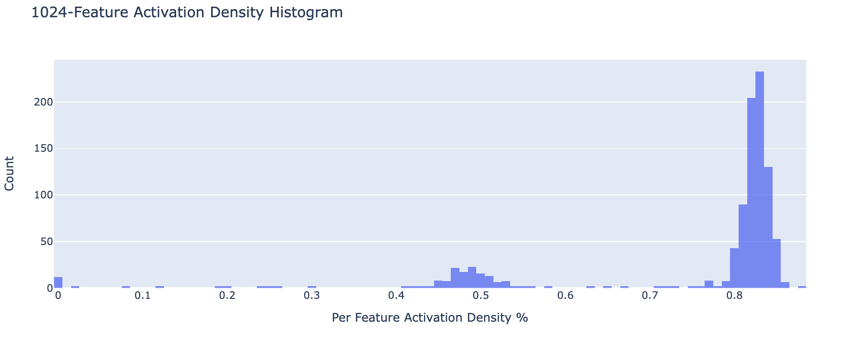 What is happening with all these dead features are they simply ultra-low density? If we look at the log histogram of feature density filtering everything above 0, it looks like few features are of density or below. The vast majority never are less active than .