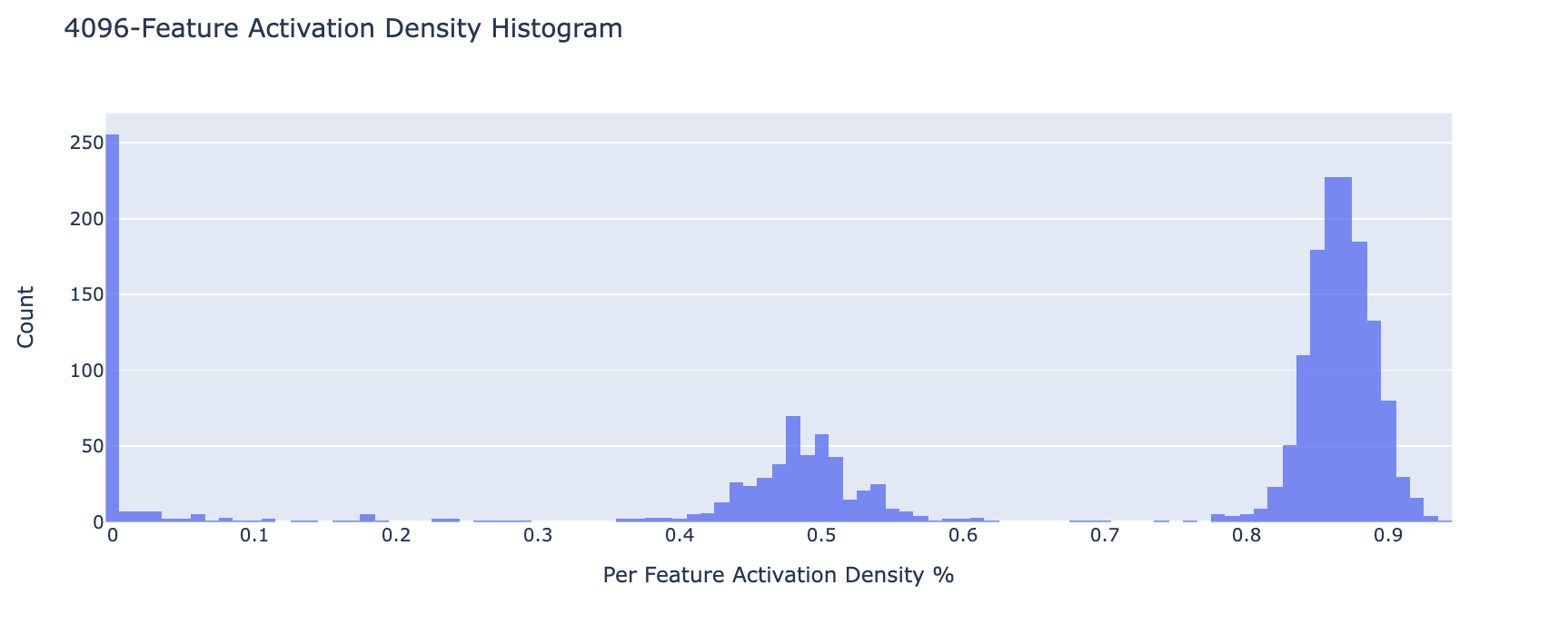 Below is a histogram (normalized w.r.t. number of features) of the distribution of feature density. Each bin corresponds to features that are active on the given bin percentage of inputs (i.e. % features that have % feature density). Notice that for the model with 16834 features a large percentage are dead/ultralow density (see blue bar next to 0). The feature density histogram for each feature is given in the appendix.