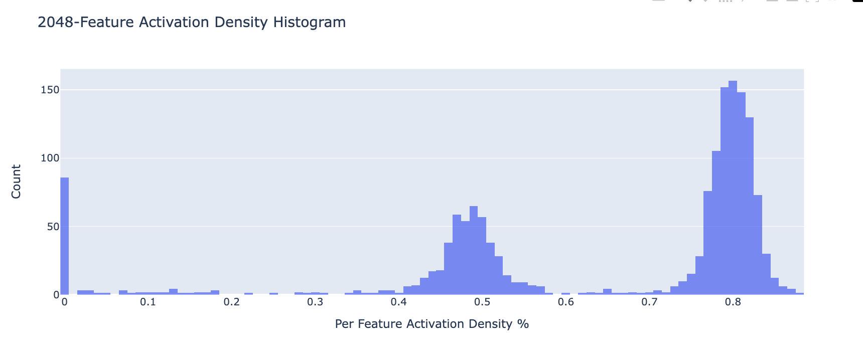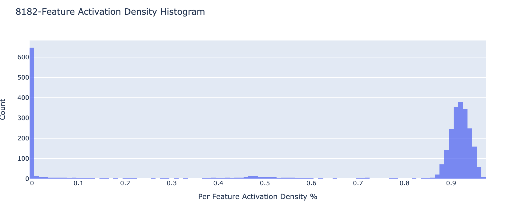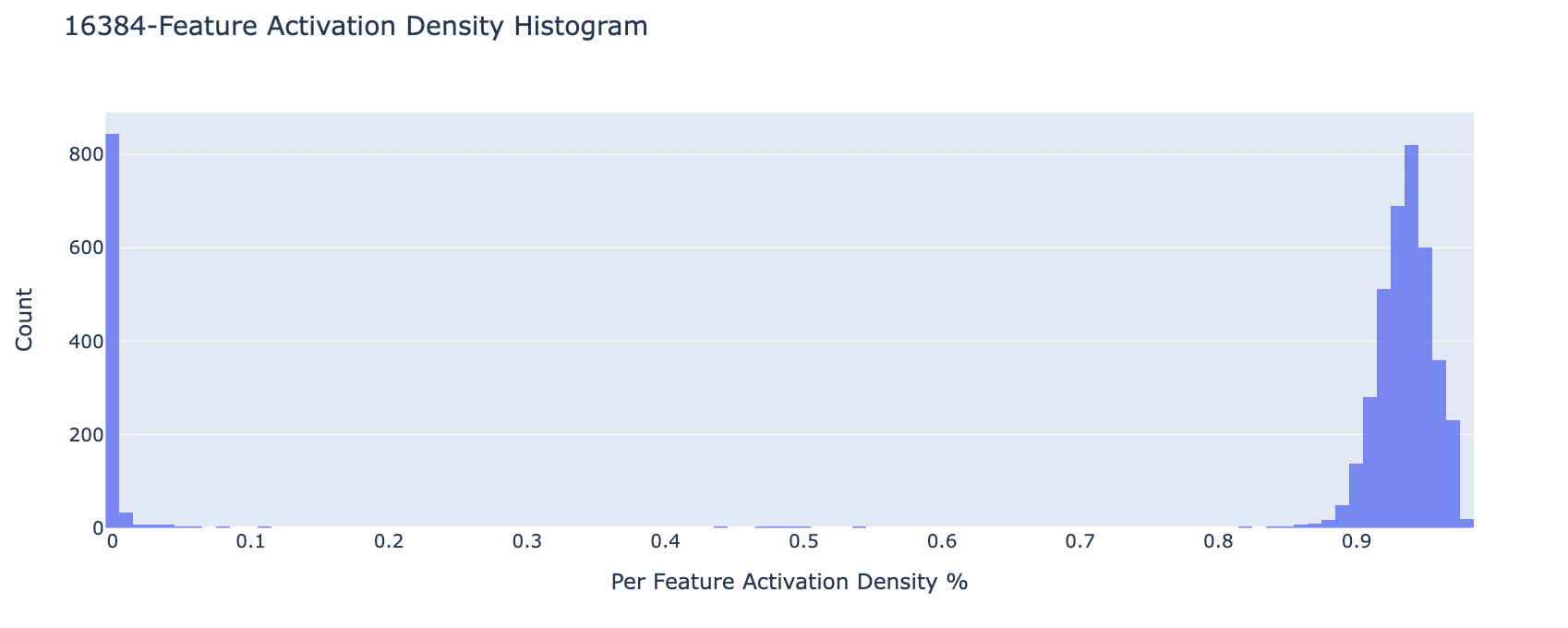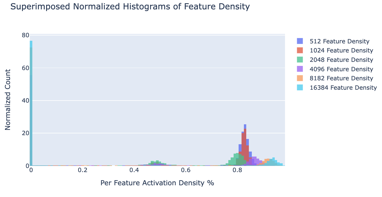 Below is a histogram (normalized w.r.t. number of features) of the distribution of feature density. Each bin corresponds to features that are active on the given bin percentage of inputs (i.e. % features that have % feature density). Notice that for the model with 16834 features a large percentage are dead/ultralow density (see blue bar next to 0). The feature density histogram for each feature is given in the appendix.