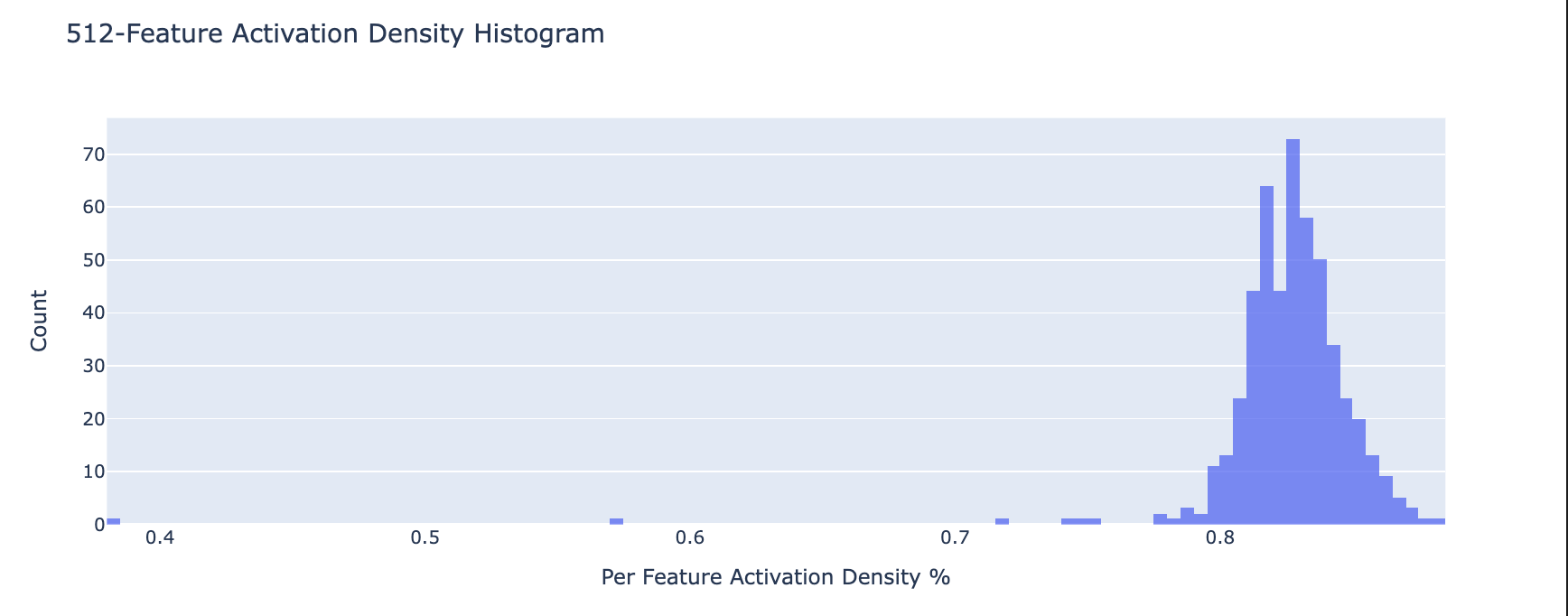 What is happening with all these dead features are they simply ultra-low density? If we look at the log histogram of feature density filtering everything above 0, it looks like few features are of density or below. The vast majority never are less active than .
