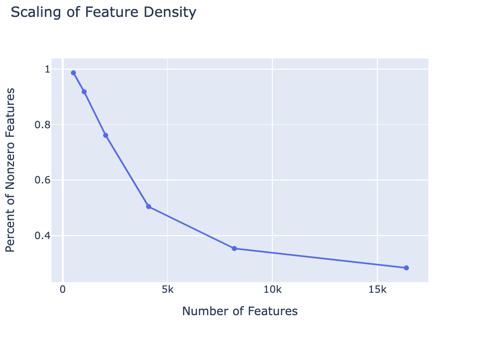 We find that the number of nonzero features scales inversely with the number of features used in our model. It seems that the number of “active” features stays relatively constant while the number of features grows leading to an inverse relation of nonzero to total features as autoencoder size grows.