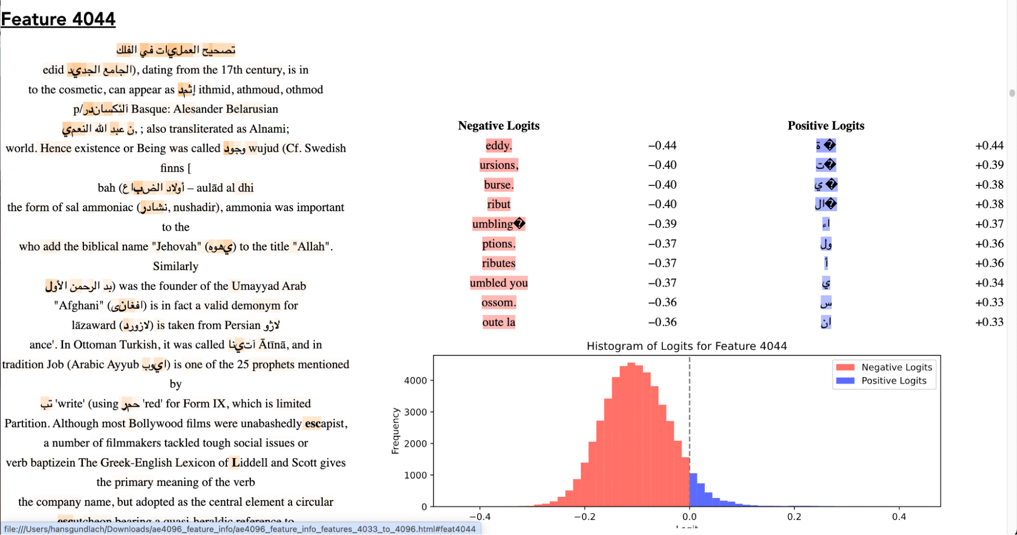 Even though we were able to find interpretable features, it was hard to find features that had both interpretable max activations and interpretable logits that matched the max activations. We would guess that more than half of our features that had interpretable max-activations did not have interpretable logit attributions. This may suggest errors with our logit attribution or max-activation sampling. However, when we tried steering our transformer by adding our given logit attribution vector to the activations, our transformer produced outputs that were coherent with the given logit attribution.